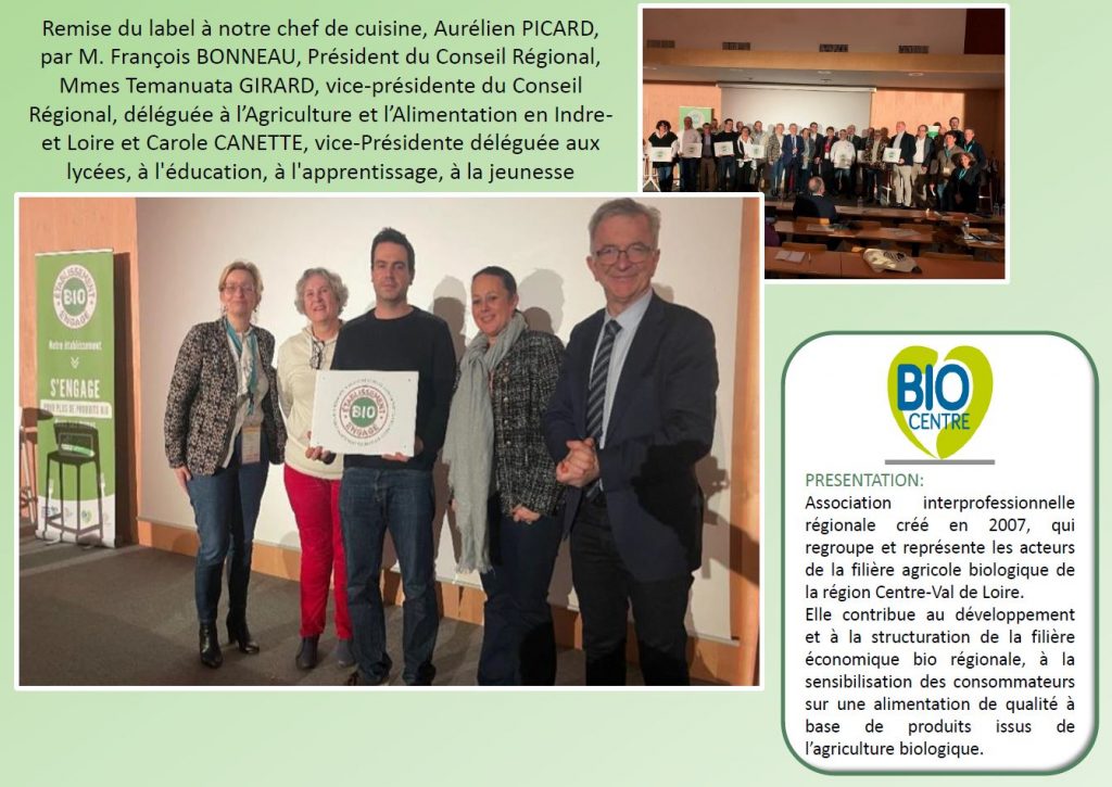 Le 29 janvier 2025, notre établissement a reçu le label « TERRITOIRE ET ÉTABLISSEMENT BIO ENGAGÉ », pour avoir atteint l’utilisation de plus de 27% de produits bio dans les repas du self.